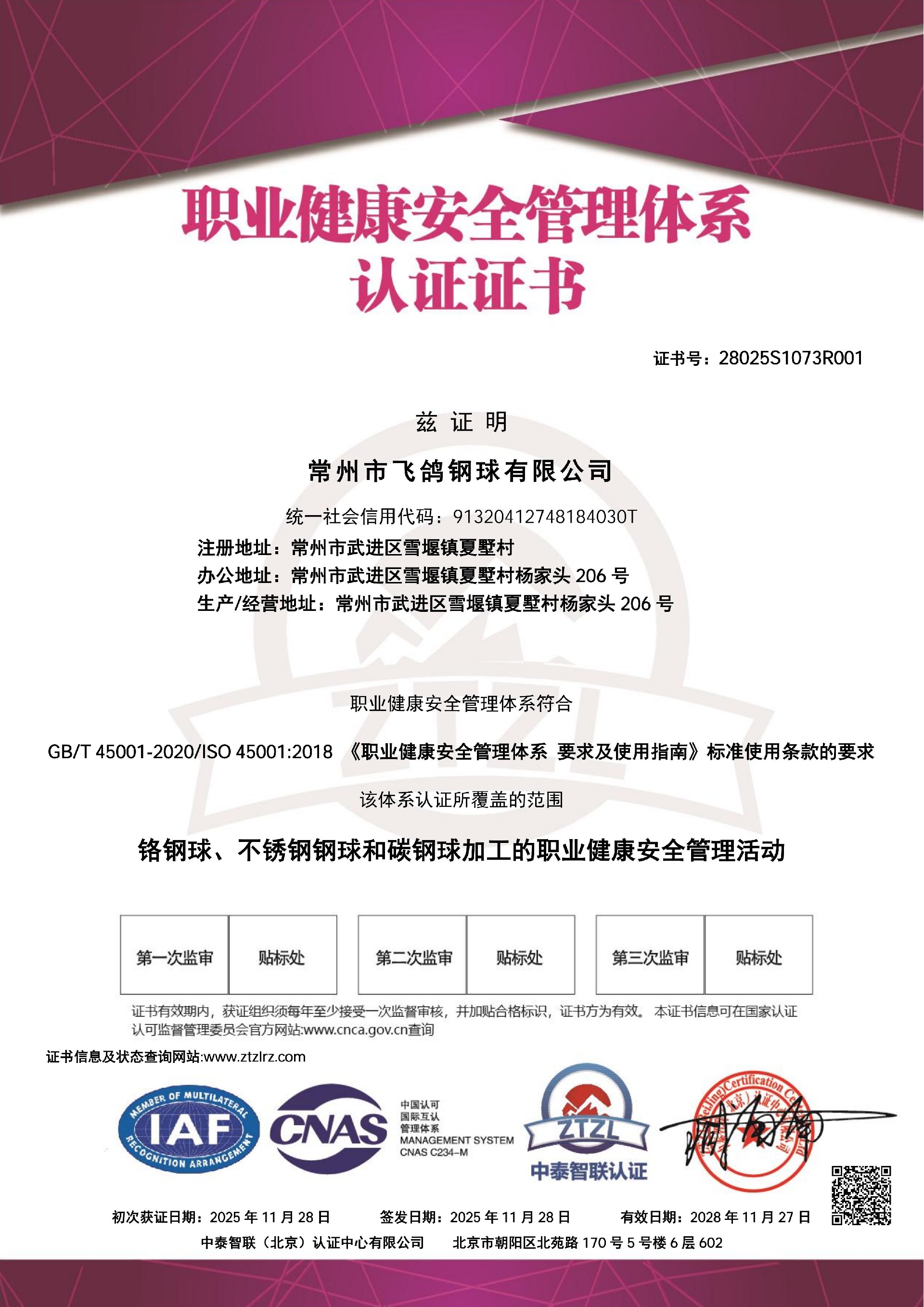 近日,飛鴿鋼球傳來重磅喜訊:公司成功通過環境管理體系認證與職業健康安全管理體系認證,正式斬獲雙體系認證證書?。↖SO 14001 ,ISO 45001 , ISO 9001 ,IATF 16949)這標志著企業在環境治理、員工健康安全保障及生產運營規范化等方面,已全面達到國際標準,為服務全球客戶增添了堅實的資質背書。