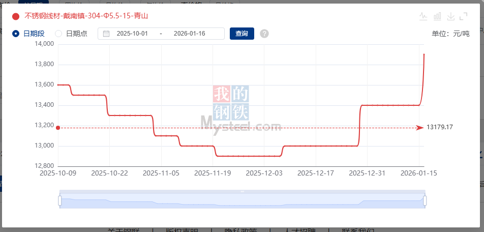 進入2026年1月,國內不銹鋼市場呈現震蕩上行態勢,304不銹鋼作為主流品種,價格漲幅顯著且韌性強勁。據無錫地區現貨市場數據顯示,截至1月23日,太鋼304冷卷價格報14800-14900元/噸,較上月同期上漲1300元/噸,漲幅達9.59%,同比去年同期亦上漲8.79%。此次價格上漲并非短期波動,而是原料成本支撐、政策利好拉動及供需格局優化多重因素共振的結果,行業景氣度持續回升。